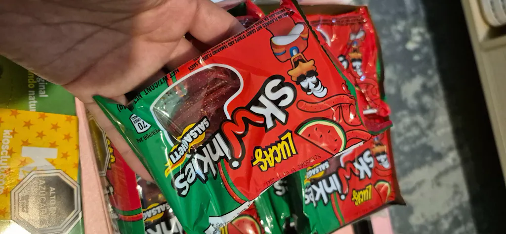 - Sabor: Tiras de caramelo con sabor a sandía, acompañadas de salsa de tamarindo picante.