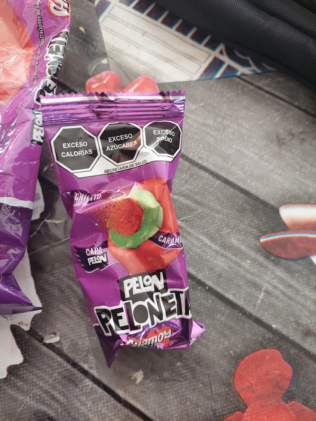 • Chupete de caramelo sabor a sandía relleno de polvo con chile y cubierta de dulce enchilado sabor a chamoy.