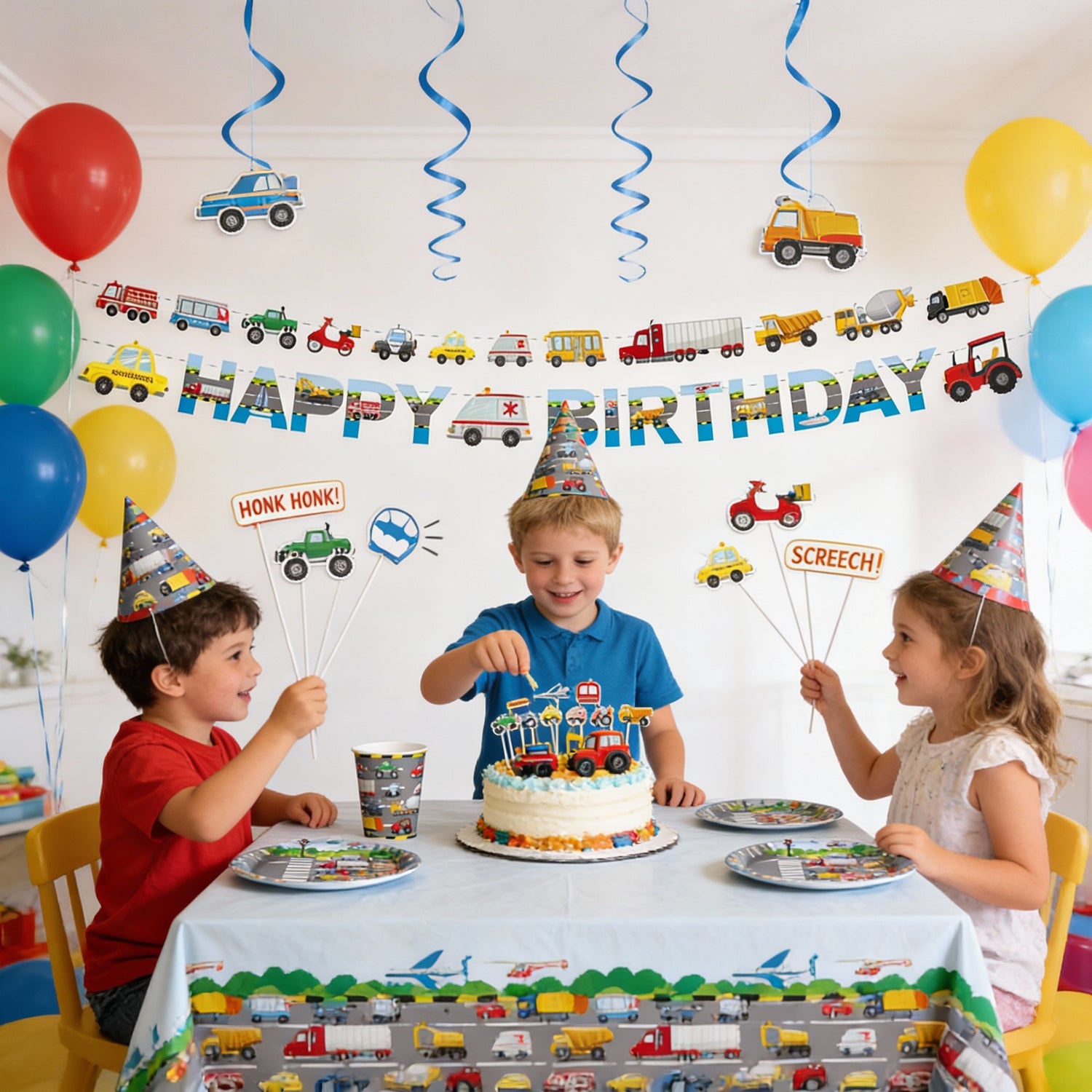 - Todo en un solo set con diseños combinados que transforman la fiesta en una verdadera aventura sobre ruedas.