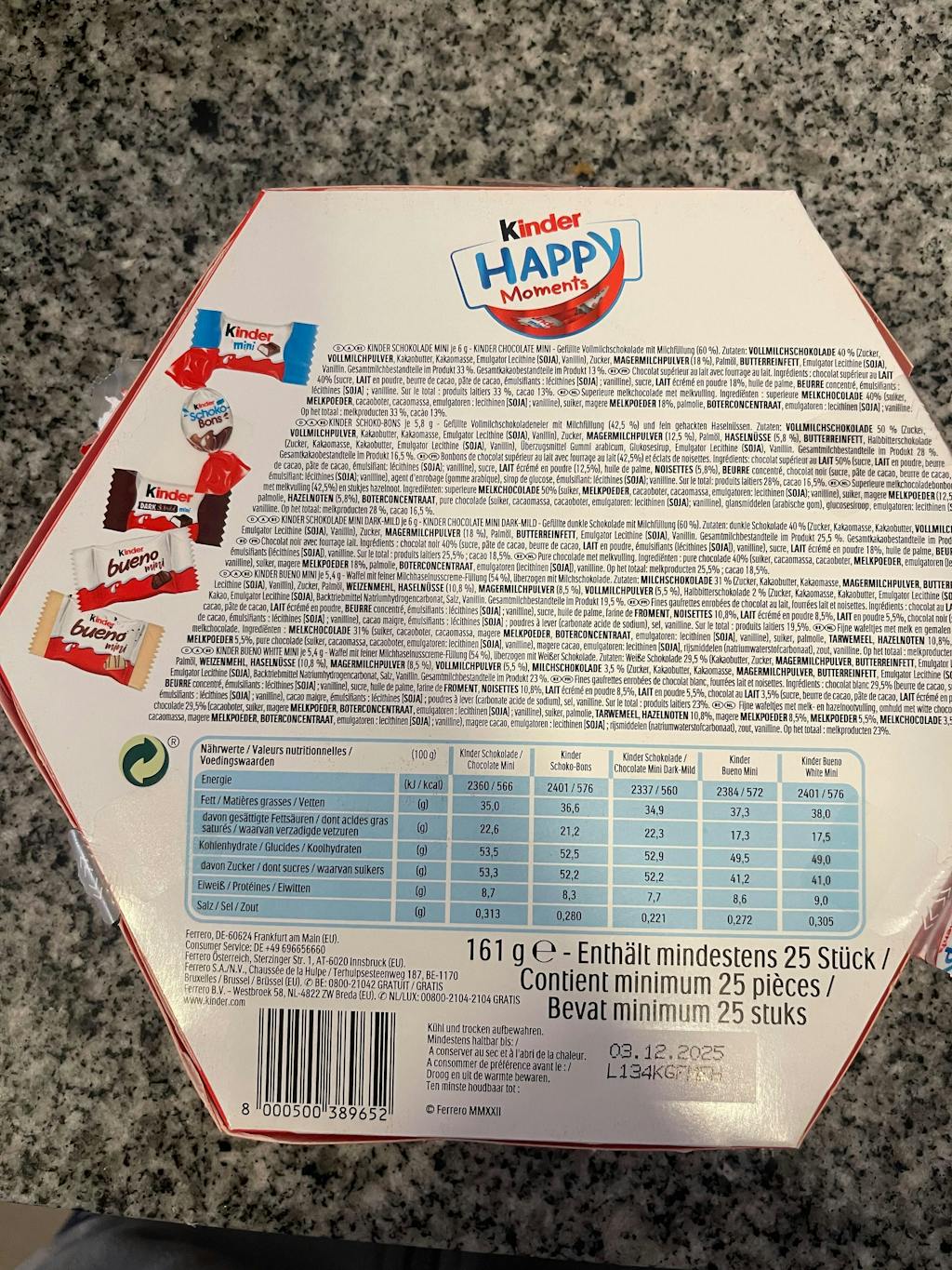 Chocolate con leche (azúcar, manteca de cacao, pasta de cacao, leche desnatada en polvo, mantequilla concentrada, emulgentes: lecitinas (soya); vainillina), azúcar, manteca de palma, harina de trigo, avellanas, leche desnatada en polvo, leche entera en polvo, chocolate negro (azúcar, pasta de cacao, manteca de cacao, emulgentes: lecitinas (soya); vainillina), cacao desgrasado, emulgentes: lecitinas (soya), gasificantes (carbonato ácido de sodio, carbonato ácido de amónio), sal, vainillina.