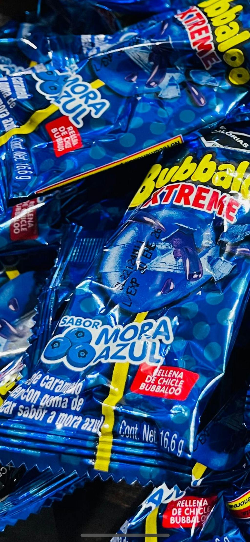 - Chupete de caramelo con chicle sabor a Mora Azul.